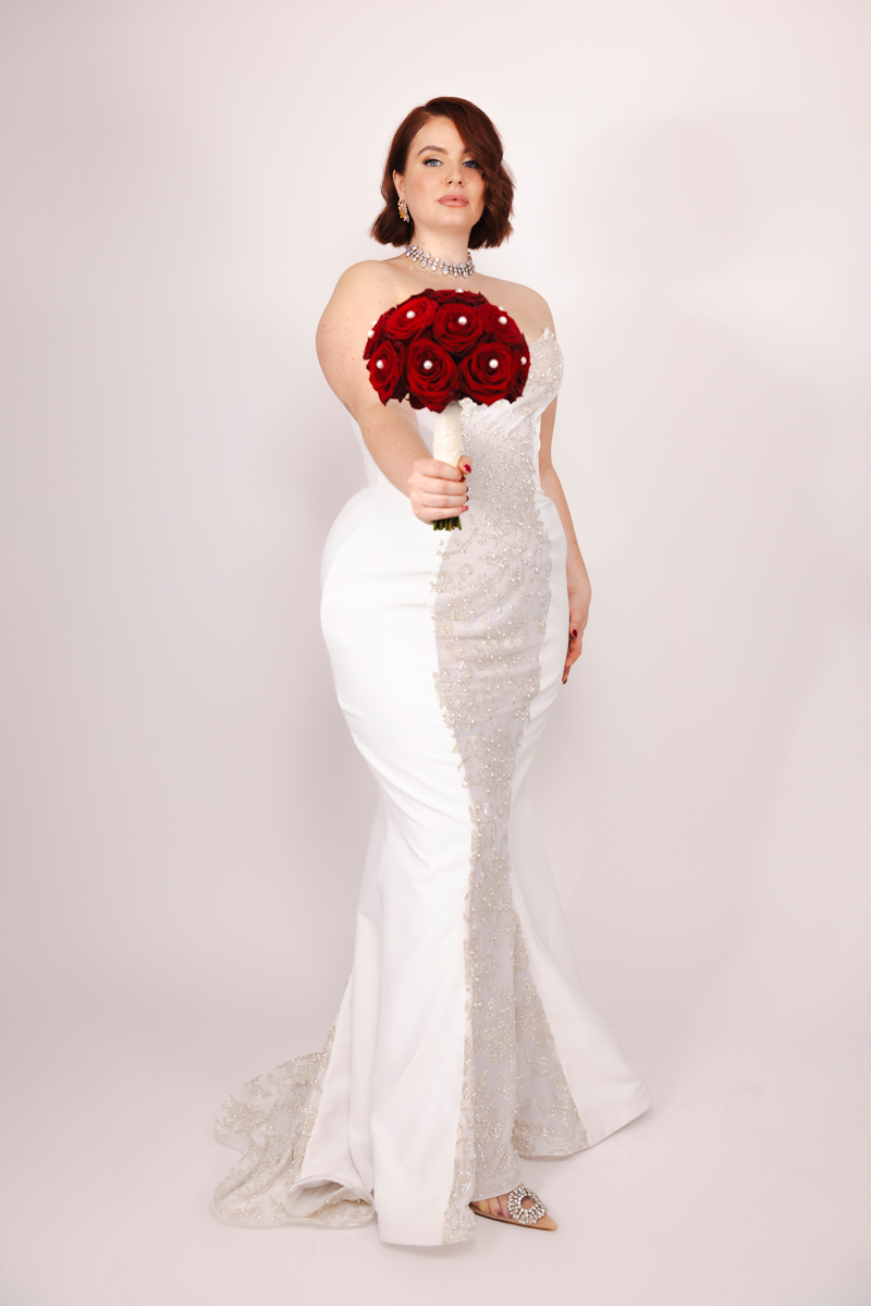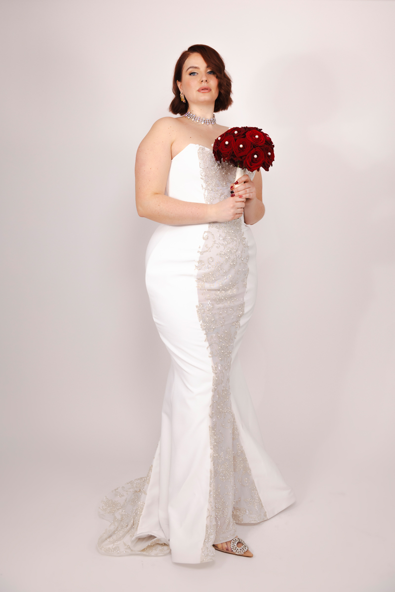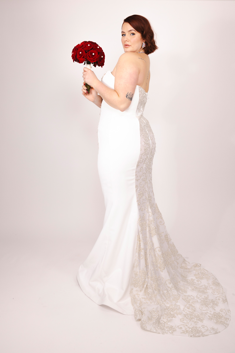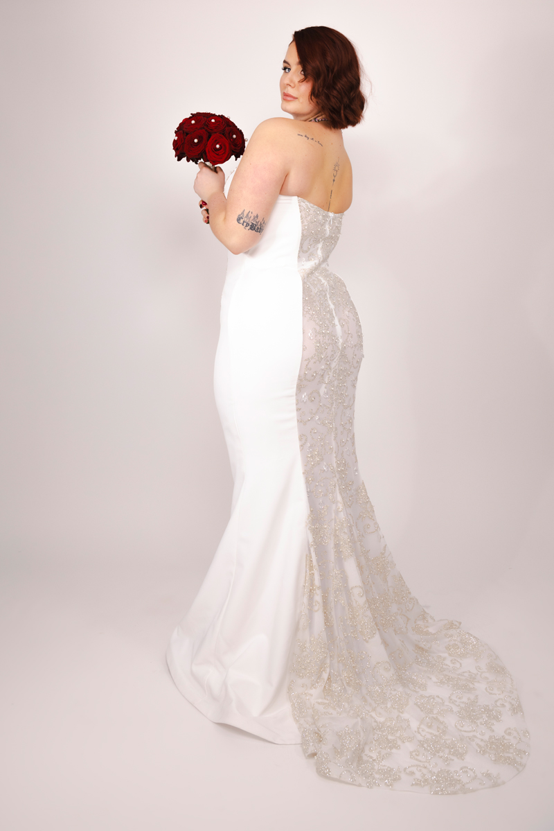 Dieses Hochzeitskleid dient als Inspirationsbeispiel für unsere exklusiven Maßanfertigungen. Jedes Brautkleid wird individuell nach Ihren Wünschen und Maßen gefertigt – von der Silhouette bis hin zu den kleinsten Details. Wählen Sie aus einer Vielzahl edler Stoffe wie zarter Spitze, fließendem Chiffon oder opulentem Satin. Mit liebevollen Verzierungen wie handgearbeiteten Stickereien, funkelnden Perlen oder filigranen Applikationen gestalten wir Ihr Traumkleid ganz nach Ihren Vorstellungen.