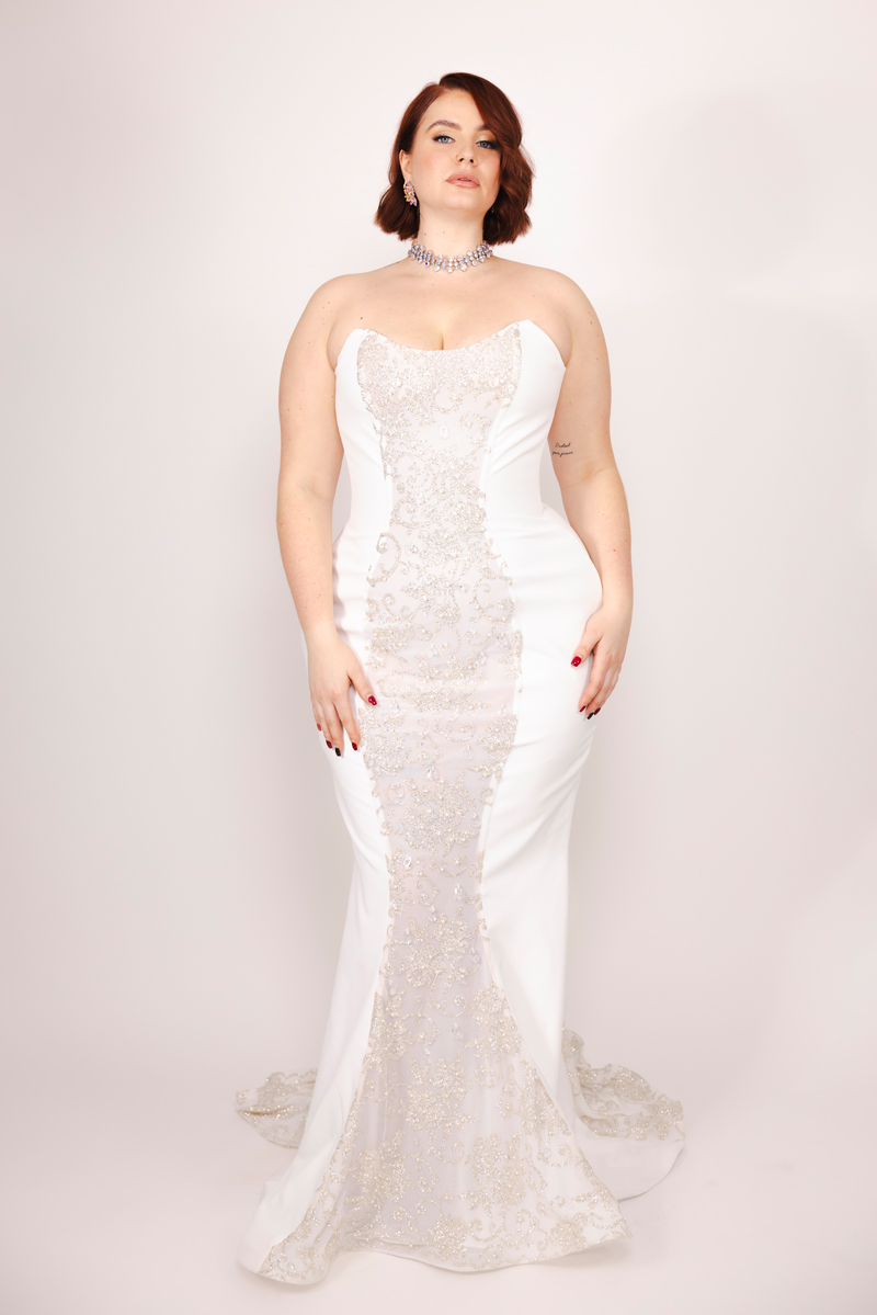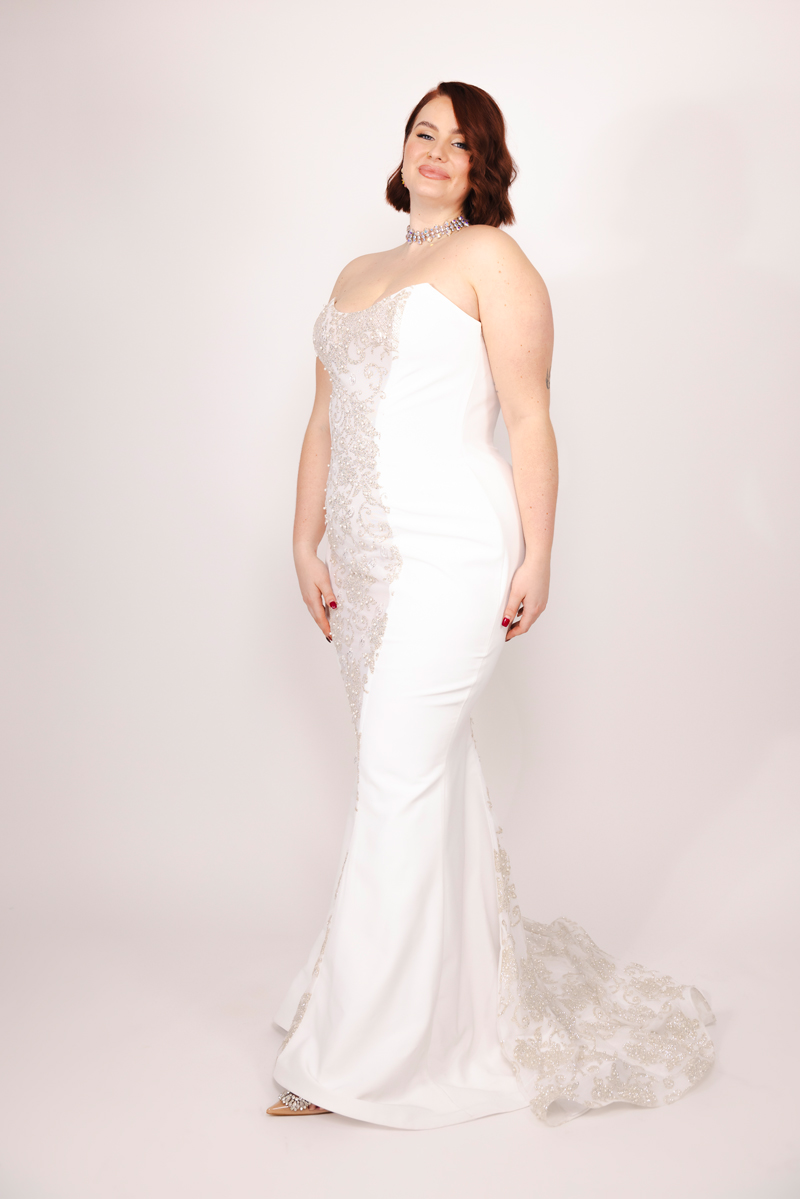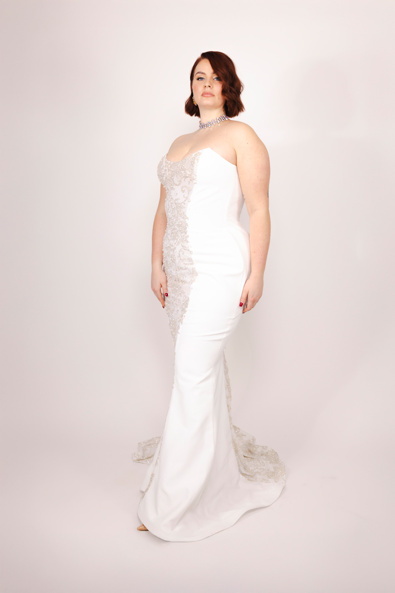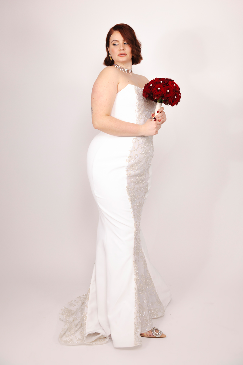 Dieses Hochzeitskleid dient als Inspirationsbeispiel für unsere exklusiven Maßanfertigungen. Jedes Brautkleid wird individuell nach Ihren Wünschen und Maßen gefertigt – von der Silhouette bis hin zu den kleinsten Details. Wählen Sie aus einer Vielzahl edler Stoffe wie zarter Spitze, fließendem Chiffon oder opulentem Satin. Mit liebevollen Verzierungen wie handgearbeiteten Stickereien, funkelnden Perlen oder filigranen Applikationen gestalten wir Ihr Traumkleid ganz nach Ihren Vorstellungen.