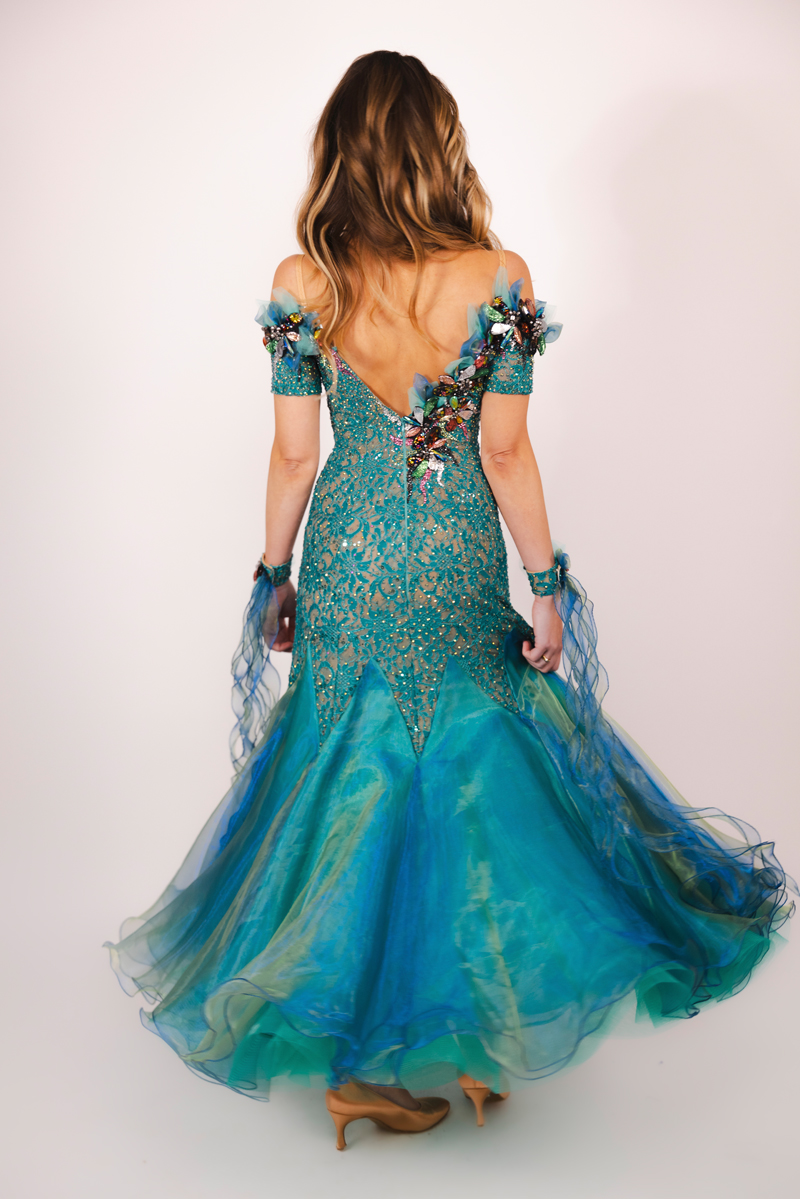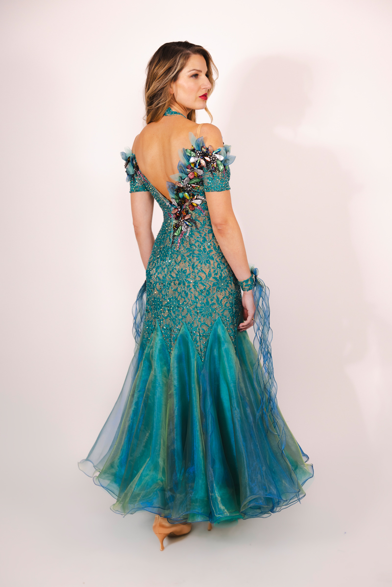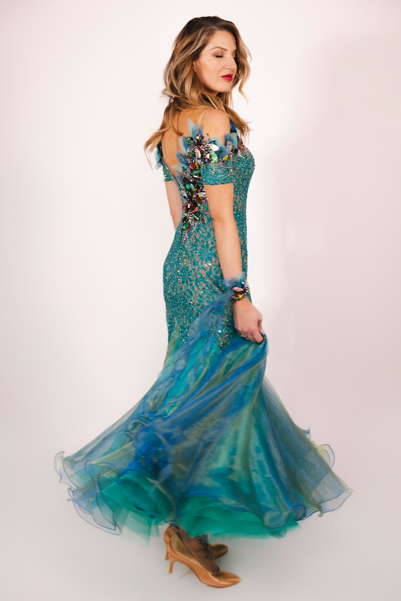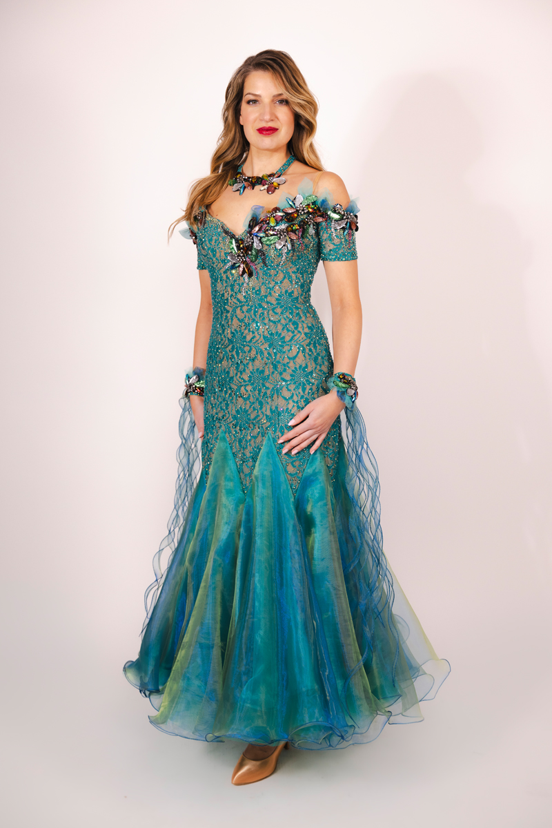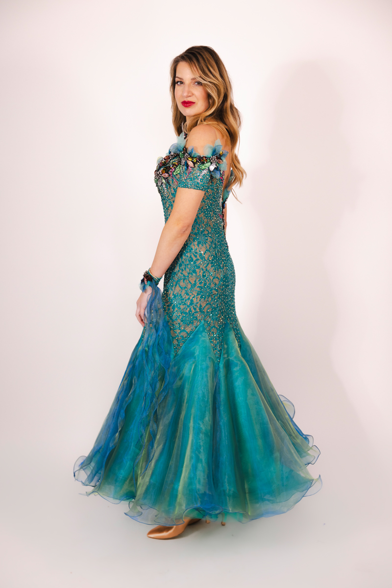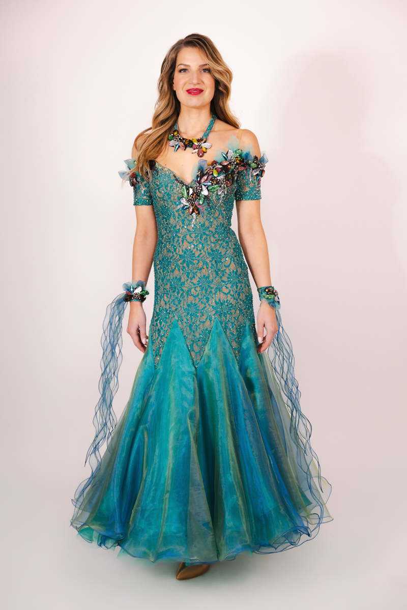 Dieses Tanzkleid steht stellvertretend für unsere maßgefertigten Designs, die Eleganz und Bewegungsfreiheit perfekt vereinen. Ob für Standardtanz, Latein oder Showtanz – wir fertigen Ihr Kleid individuell aus hochwertigen Stoffen wie elastischem Jersey, federleichtem Organza oder glitzerndem Lycra. Mit raffinierten Details wie Fransen, Strasssteinen oder kunstvollen Stickereien setzen wir Ihre Bewegungen eindrucksvoll in Szene und sorgen für einen atemberaubenden Auftritt auf der Tanzfläche.